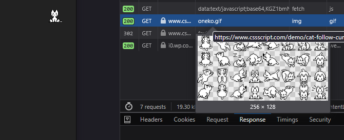 As you can see it uses a spritesheet, where the animation frames are all on the same one image, tiled. The other JS spritesheet I know of is the oneko cat cursor animation!
