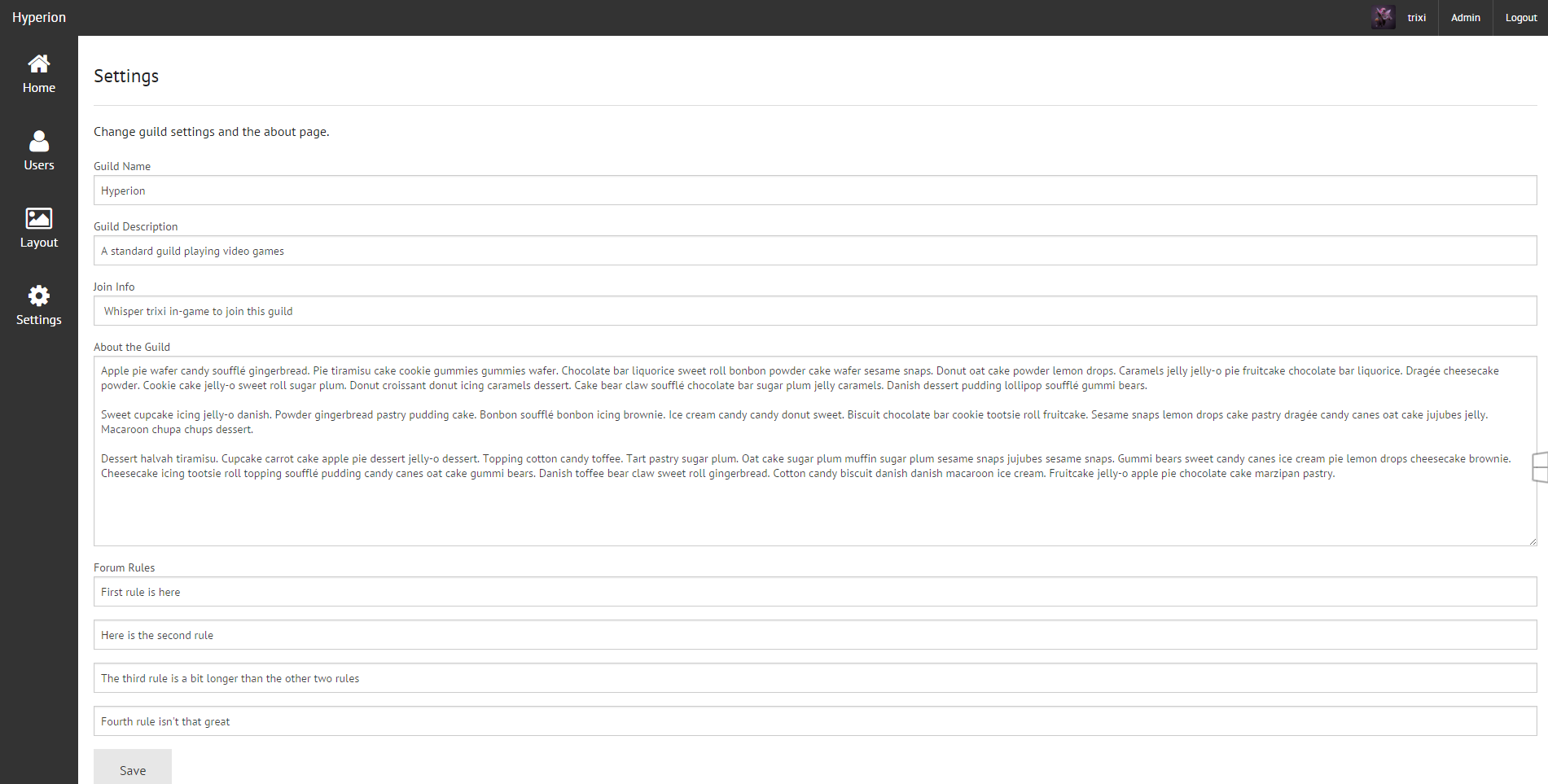 - Admin settings/layout to customize guild