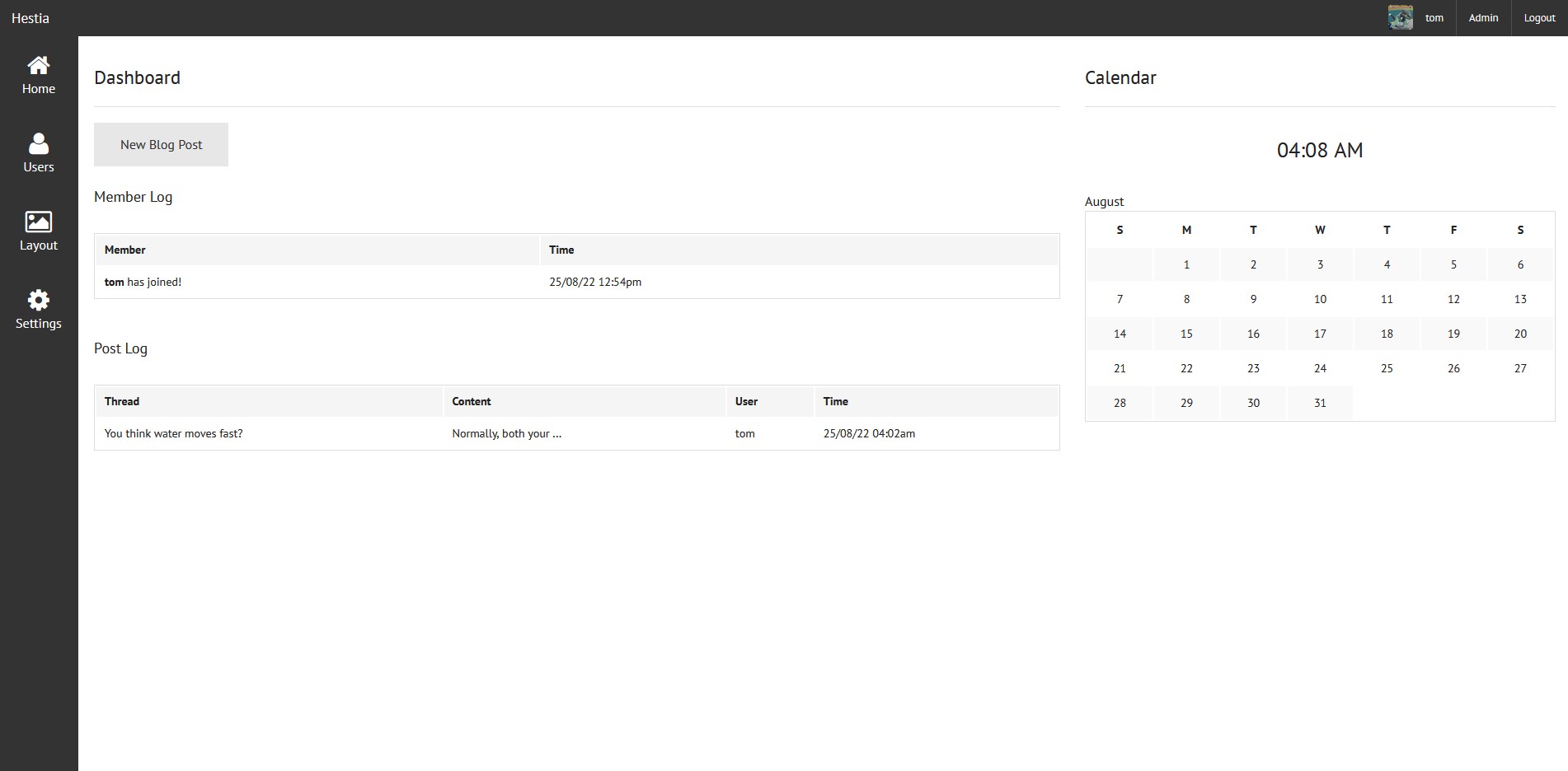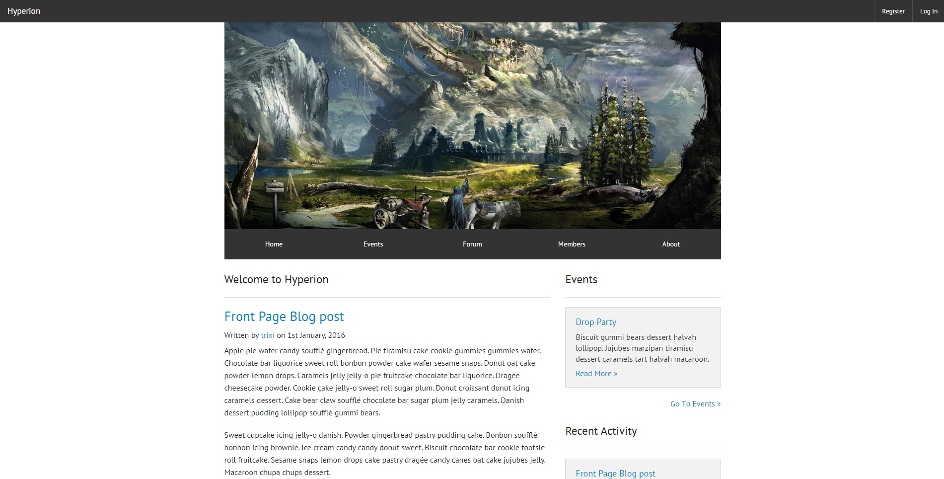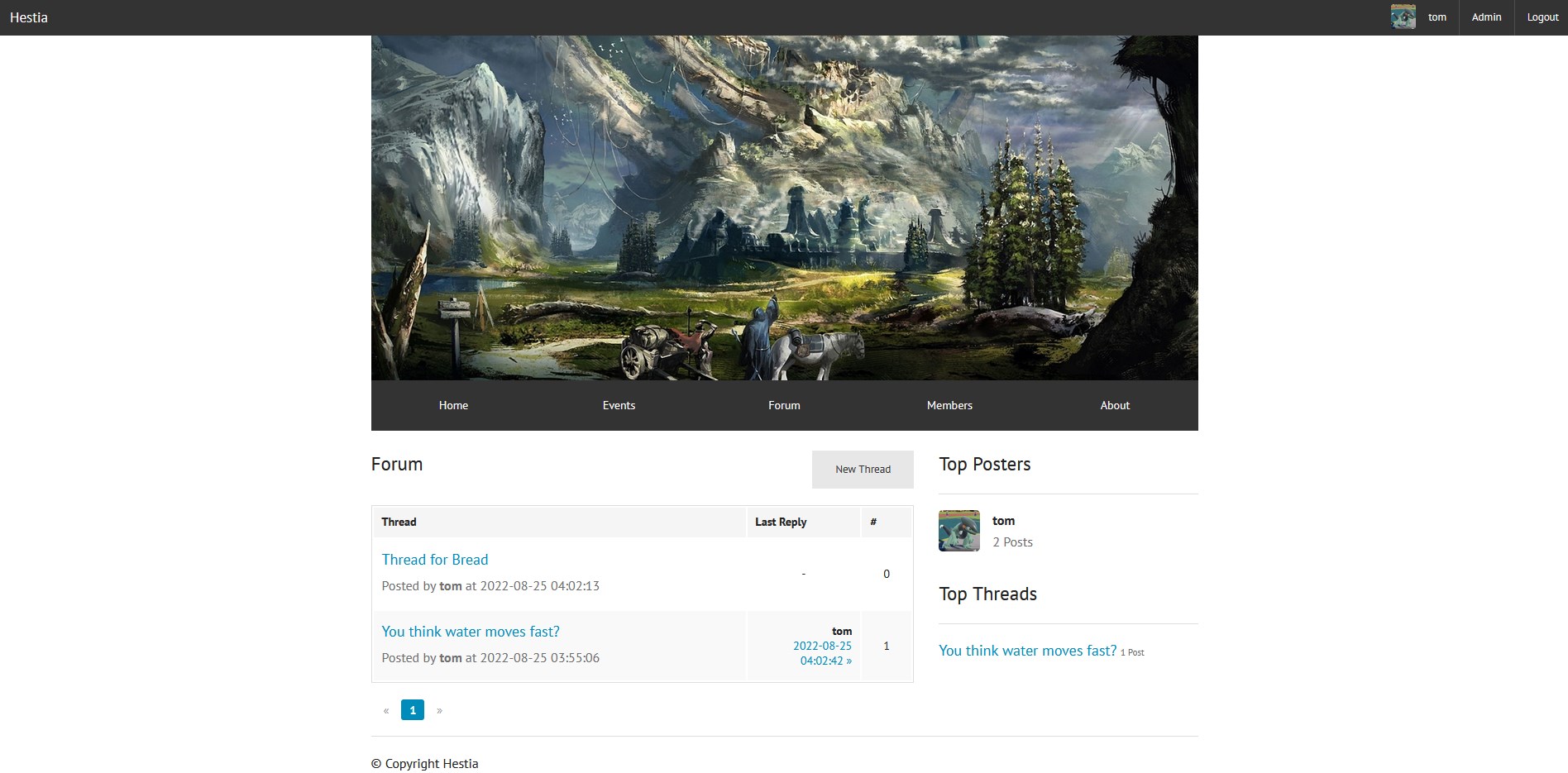 - Home page shows blog and latest events and threads