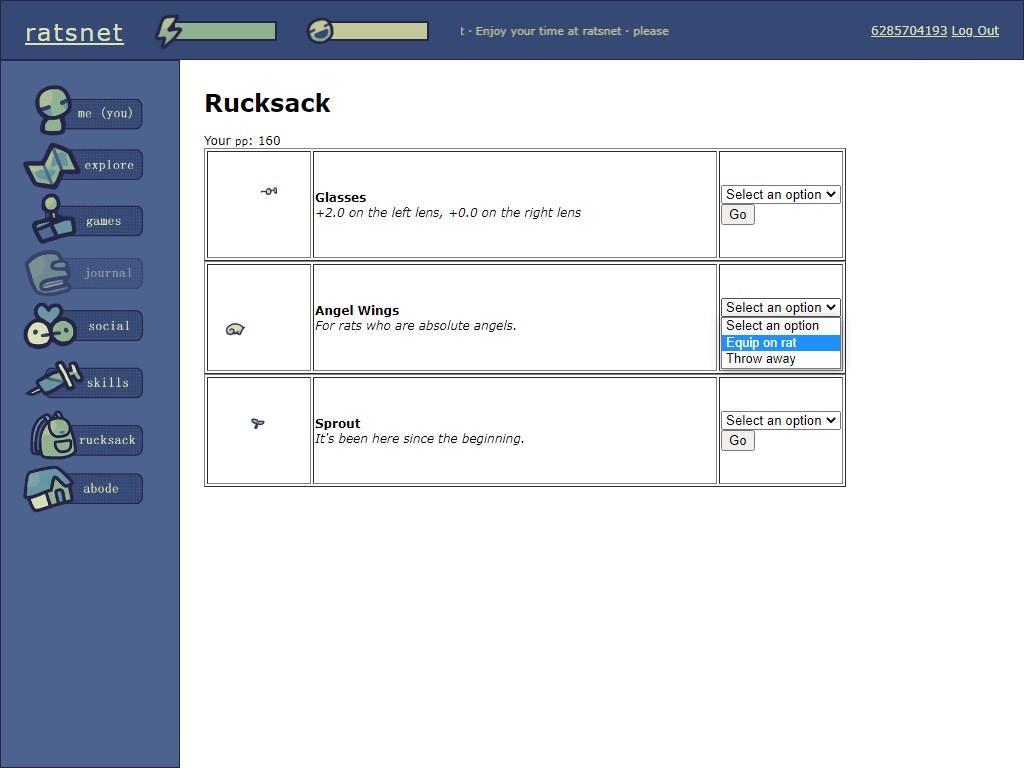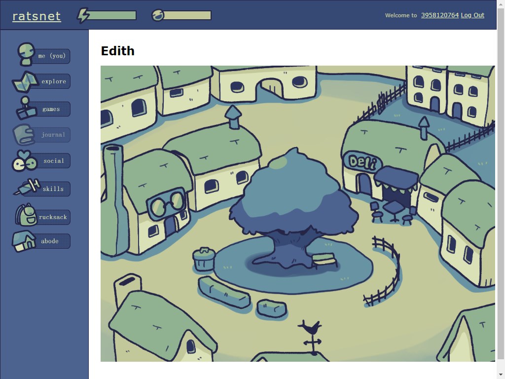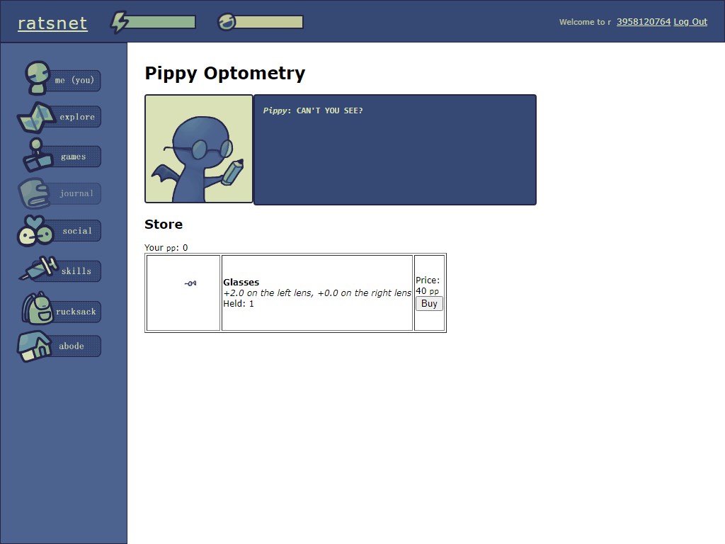 The first menu item takes you to your profile page, where you can set your location, catchphrase, and look at your pet rats' statuses.