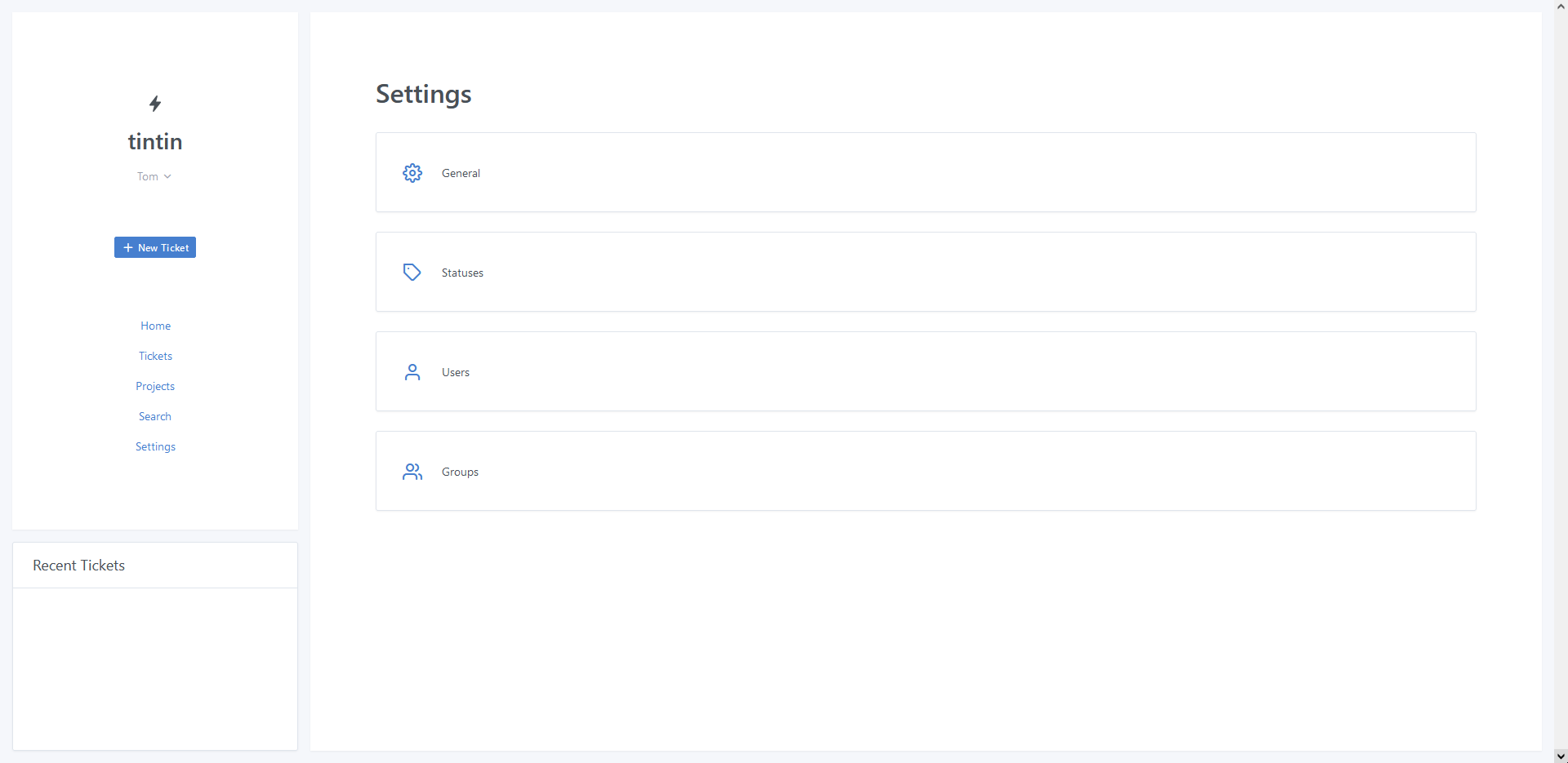 The layout is 2-column with a menu and recent tickets on the left, and page body on the left.