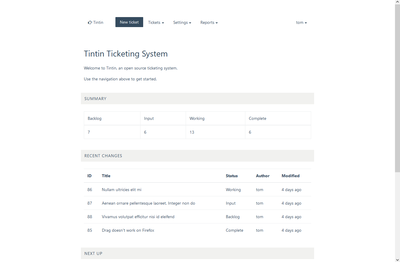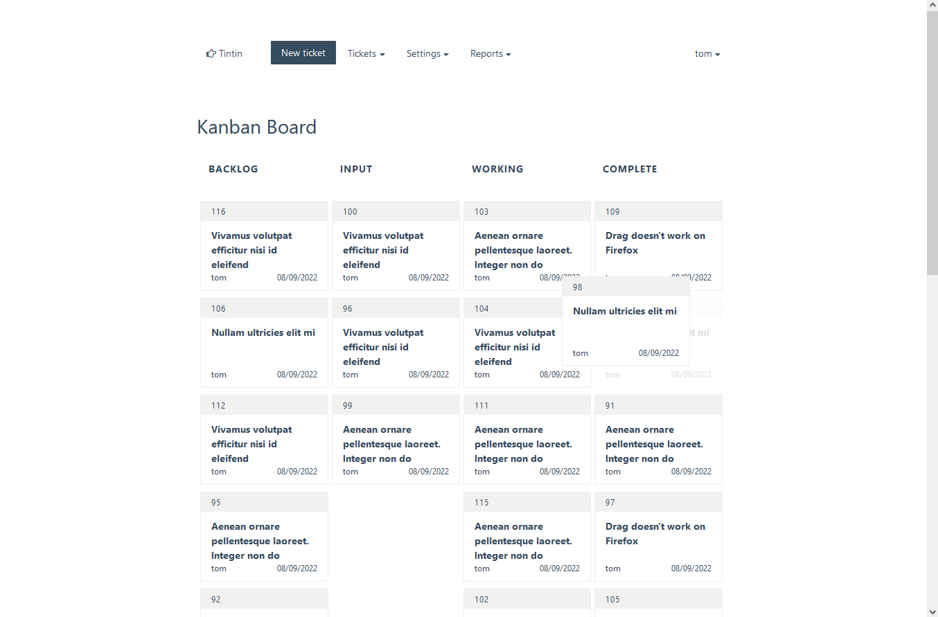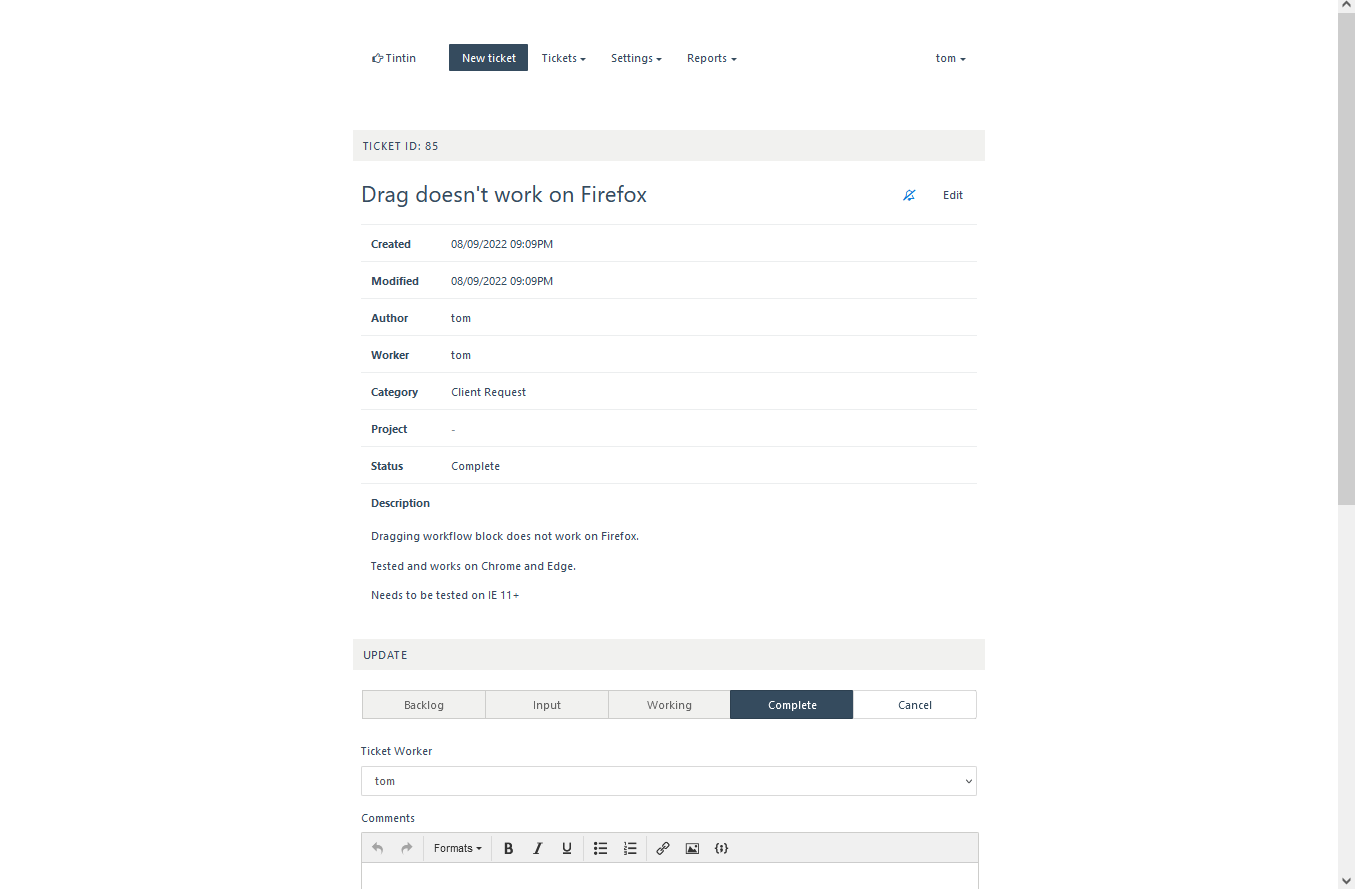 Tintin is a ticketing system. Ticketing sites are used to keep track of issues and/or assist with project management. It was heavily inspired by the ticketing system my workplace used at the time, which was Trac SVN.