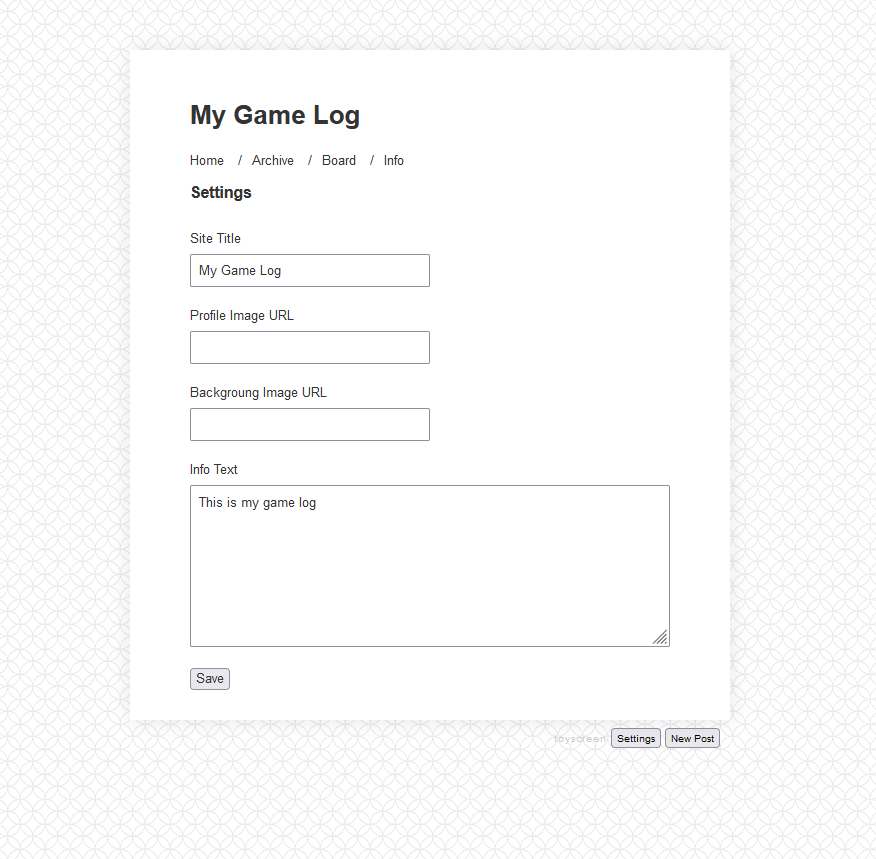 The setup page for the blog: